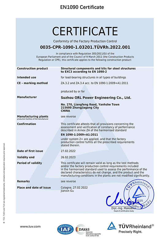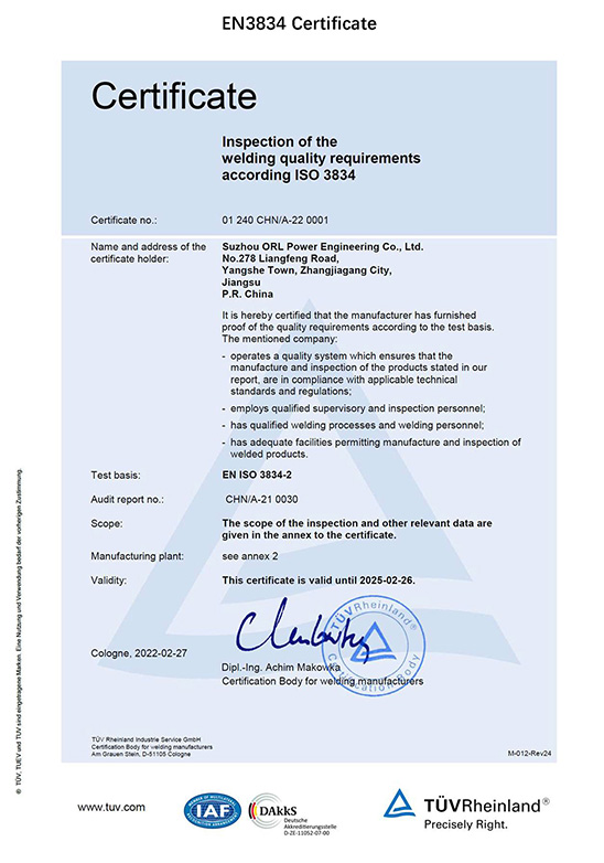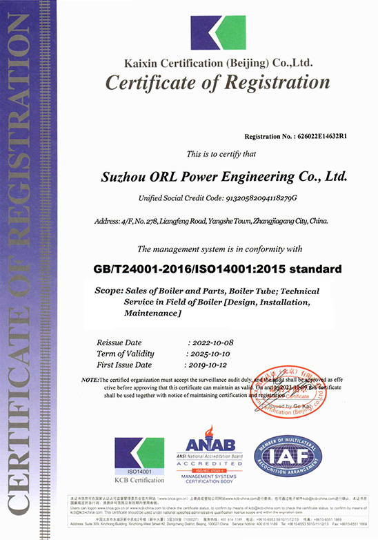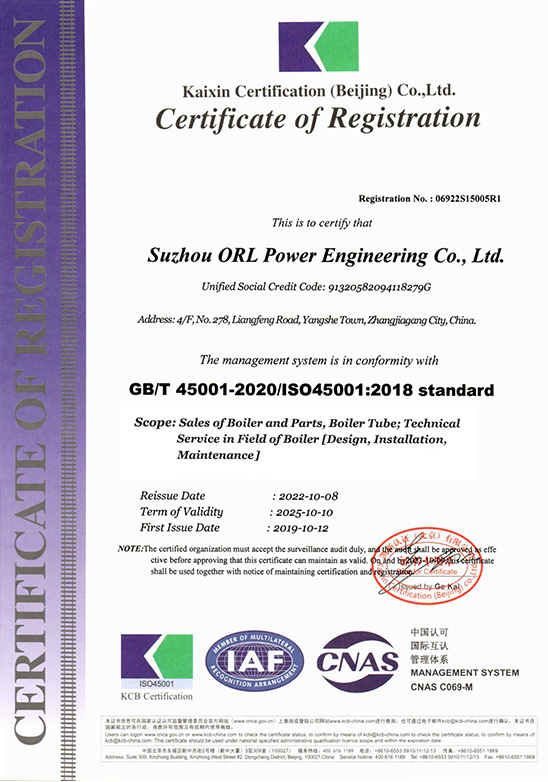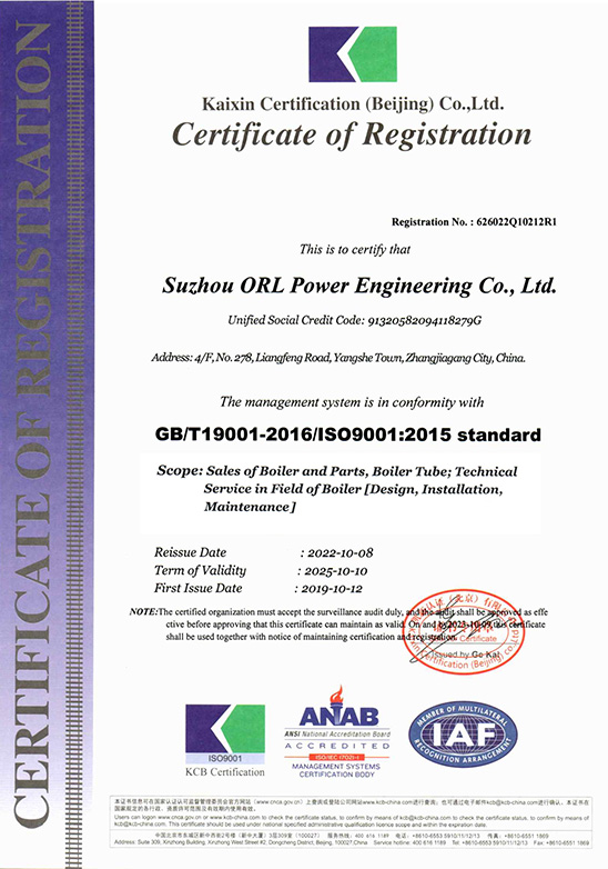 Компания ORL имеет национальные и международные сертификаты, включая EN3834, EN1090, ISO9001, ISO14001, ISO45001, лицензию категории (A) на проектирование и производство котлов (GB), а также штампы ASME «S» и «U» и другие.
